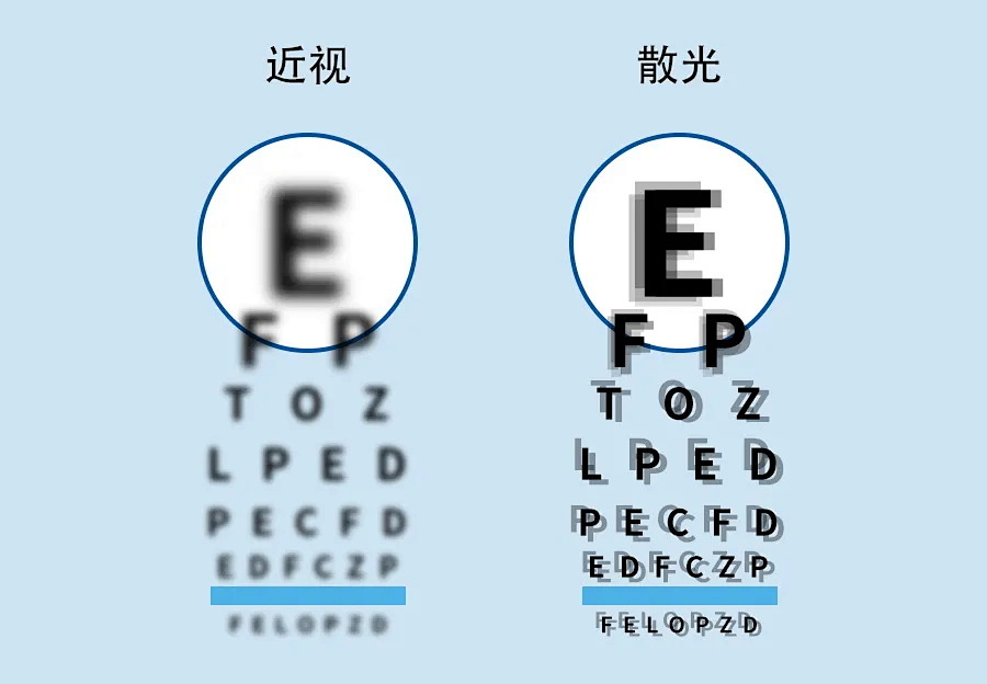 通俗來講,散光就是看遠近物體都不清楚,光線散開了,光線進入眼球以后,它不能聚成一個焦點,導致看東西會有光圈、重影、變形的狀態。